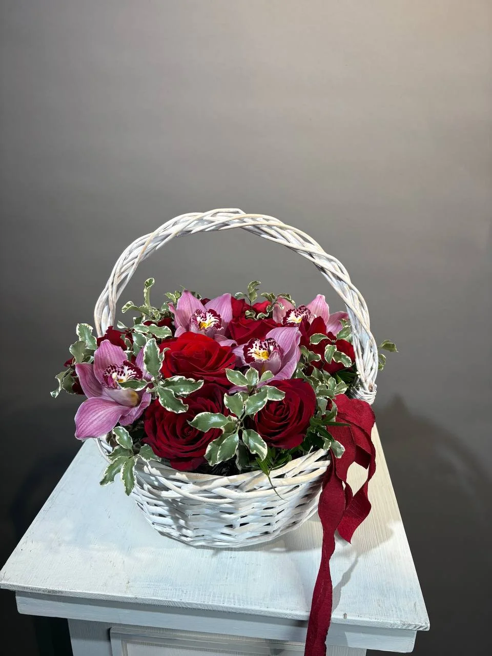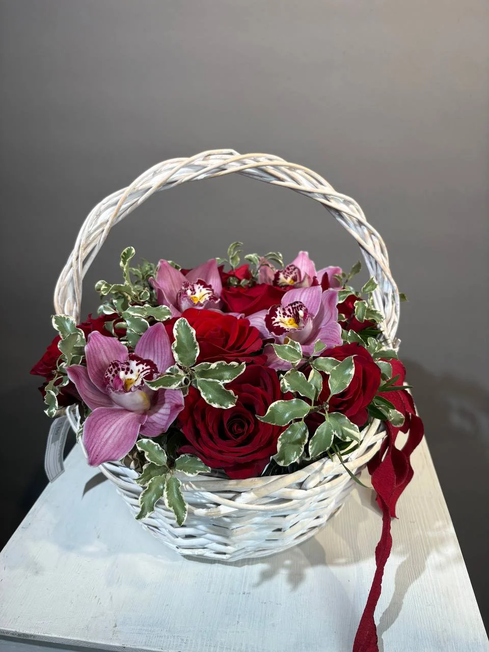 Корзина с красными розами и орхидеей