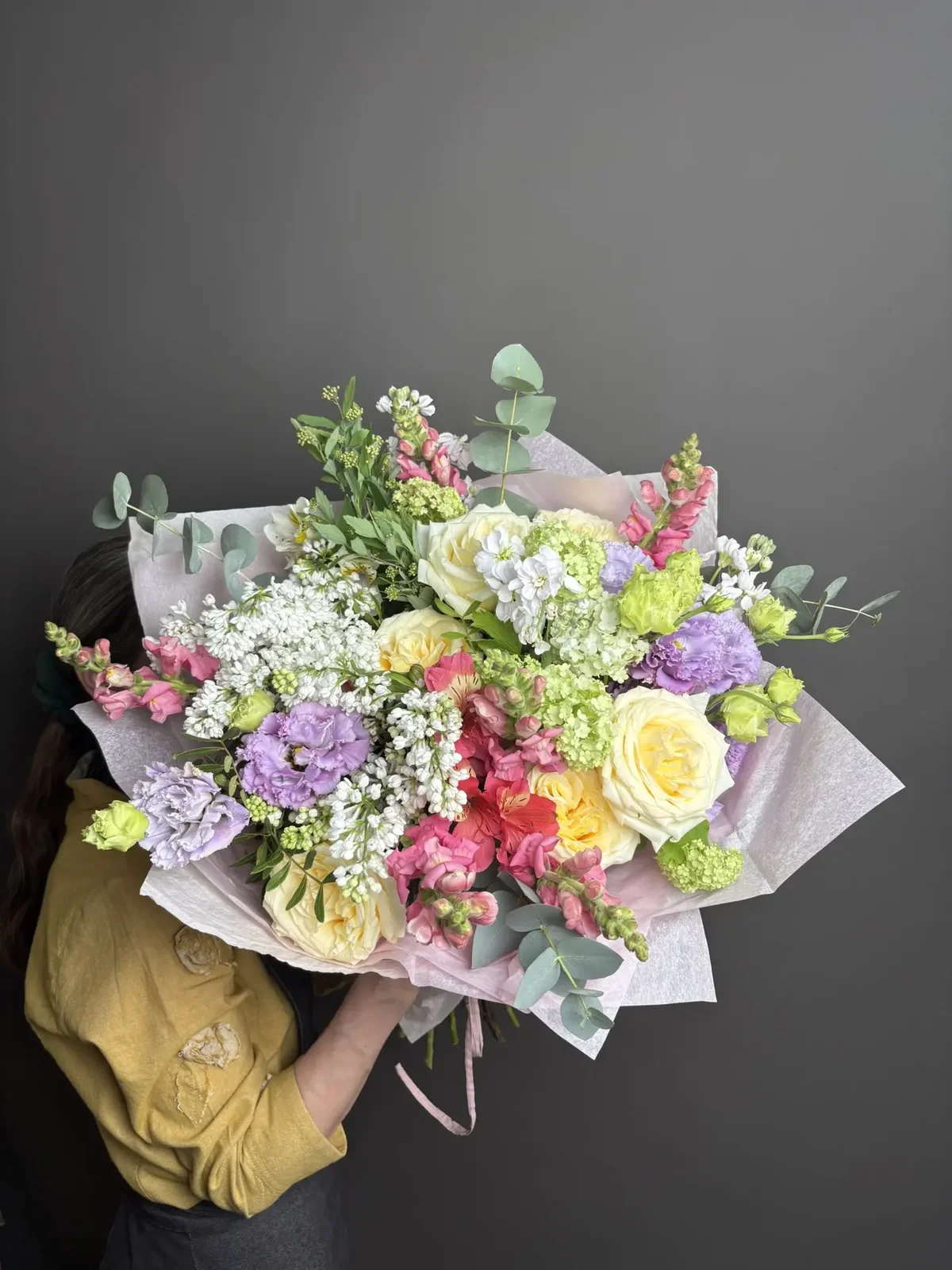 Состав букета мгновенно поднимает настроение. Сирень, львиный зев, эустома, вибурнум