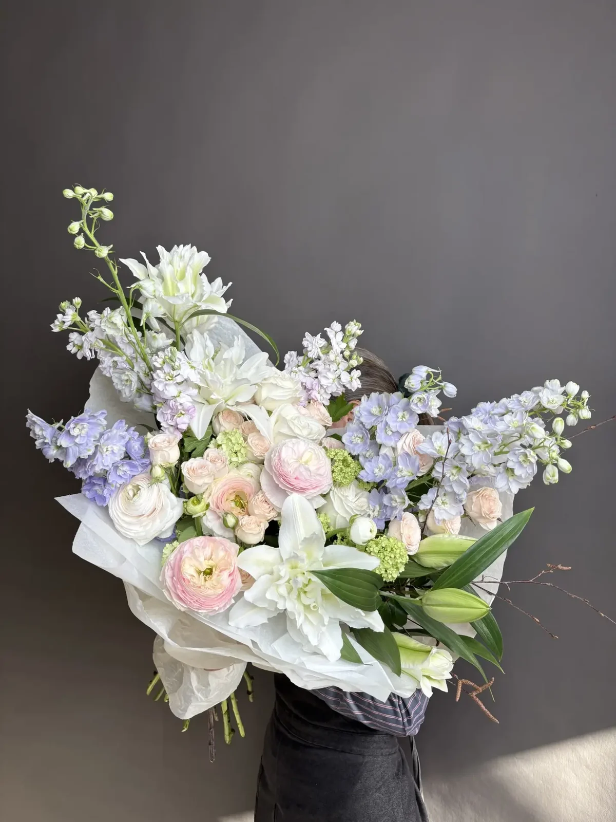 Авторский букет с дельфиниумом и ранункулюсами