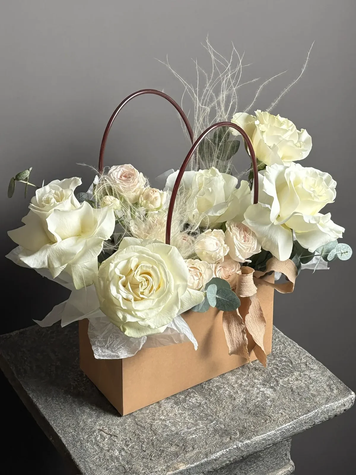 Композиция с белыми розами и эвкалиптом