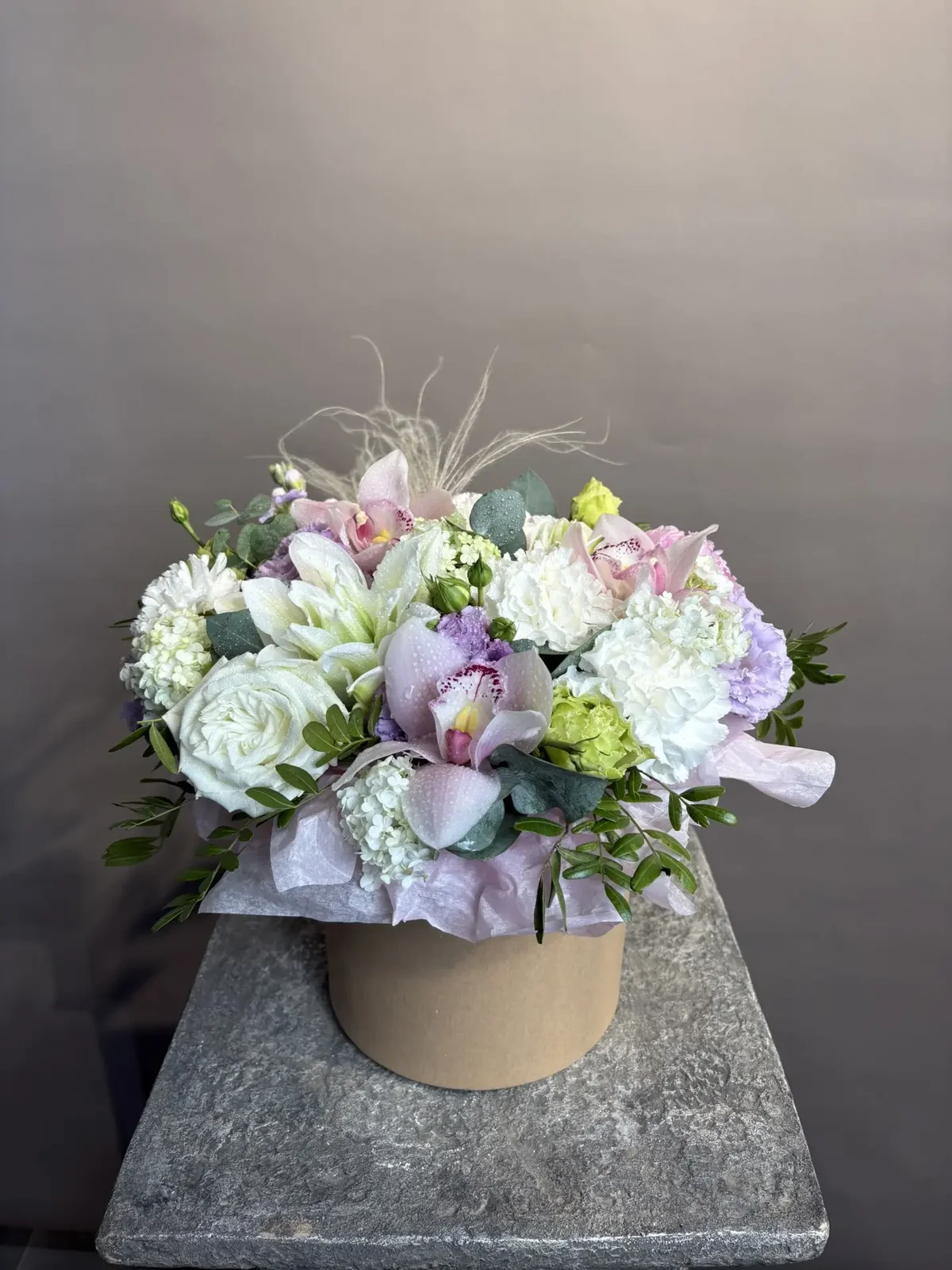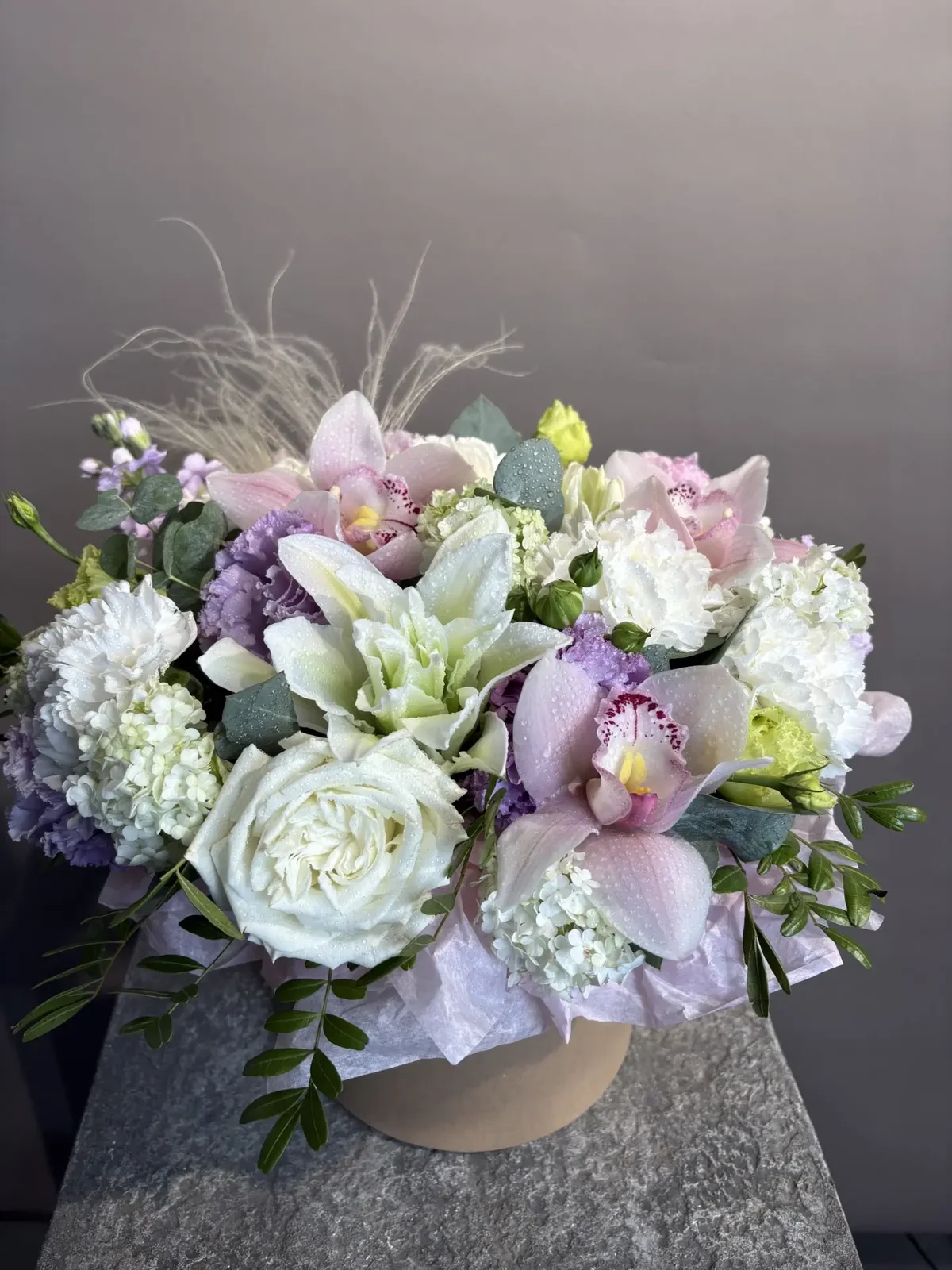 Нежная композиция с орхидеями и пионовидными розами