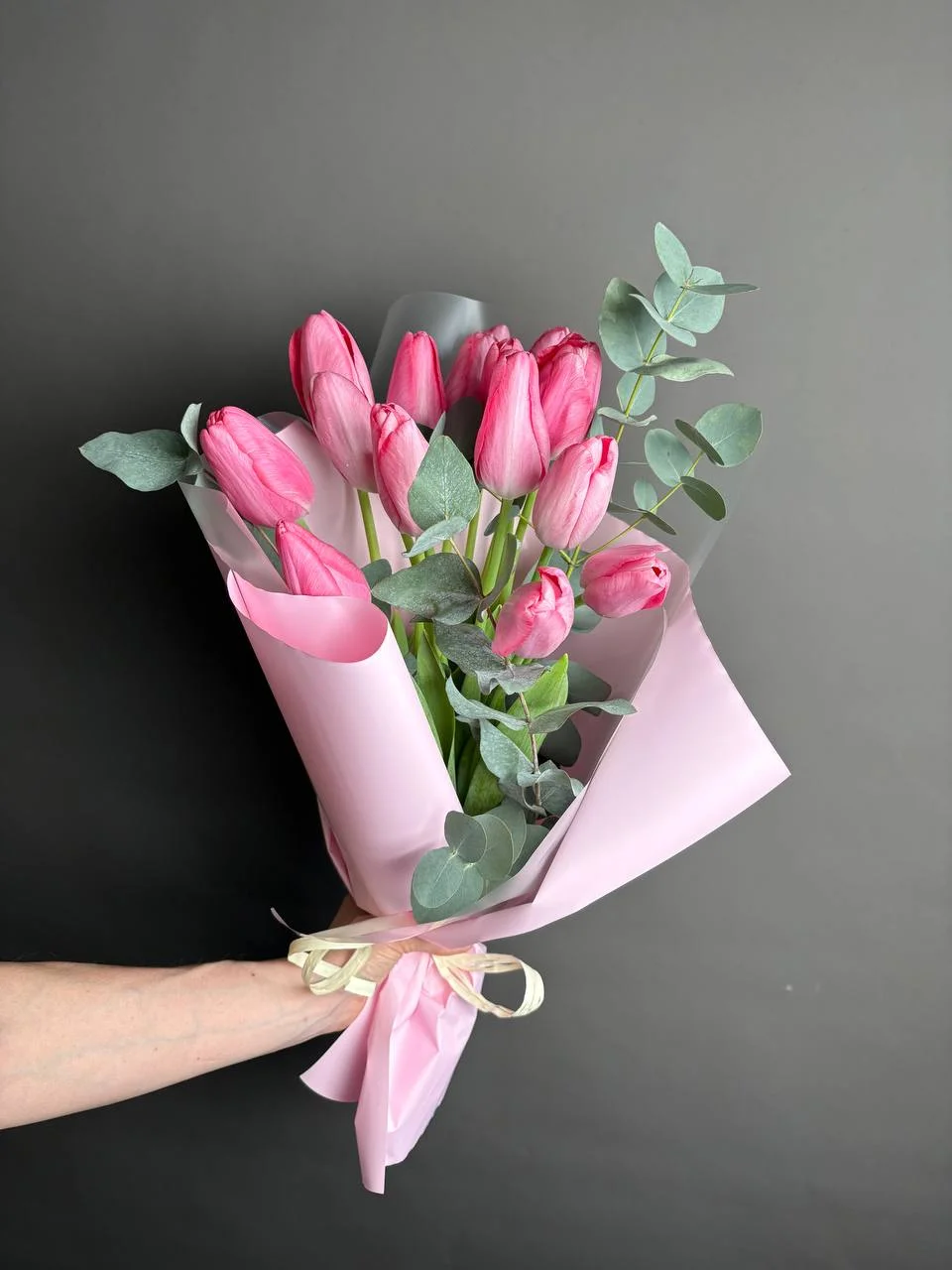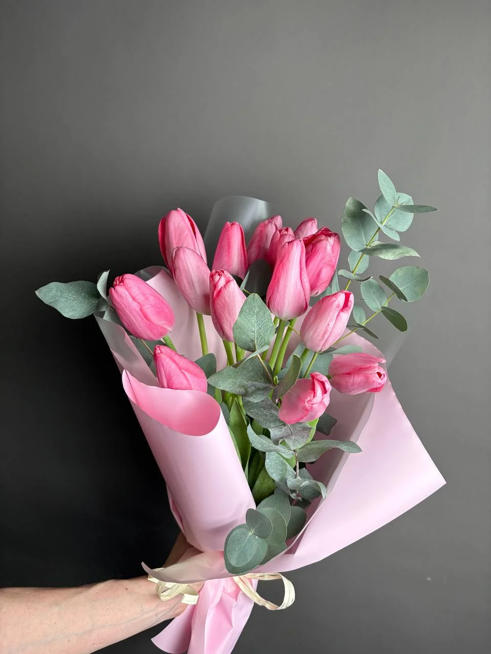Нежные тюльпаны 15 штук с эвкалиптом